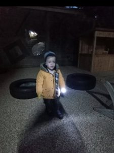 What fun it is now that the evenings are drawing in to take advantage of the darkness and go out and explore light, dark and shadows with the torches. It fills us with excitement, awe and wonder to shine the torches and turn them on and off and see what we can see (…. or …
