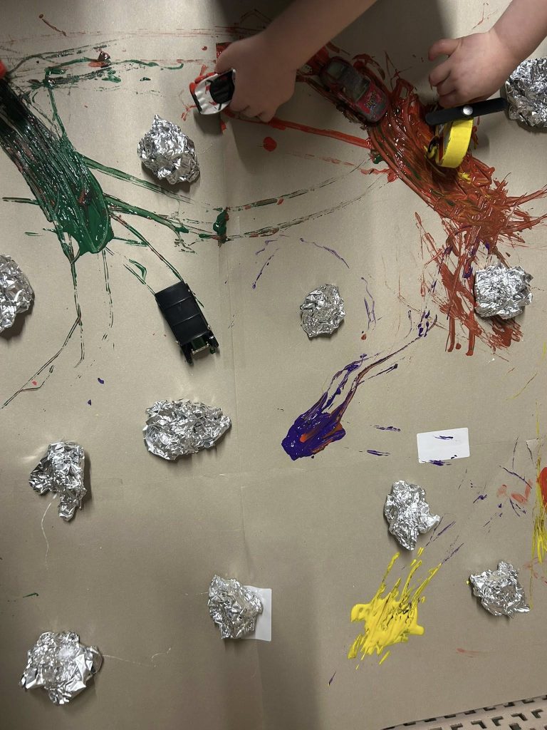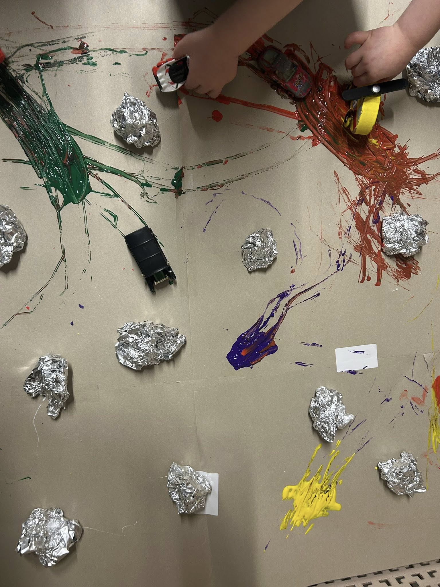 Combining paint with cars was the perfect combination for Exploring Elephants today…. They whizzed their vehicles through the different coloured paint to create track marks of their cars differing journeys! There were extra challenges involved as tinfoil boulders were obstacles that needed to be navigated!!