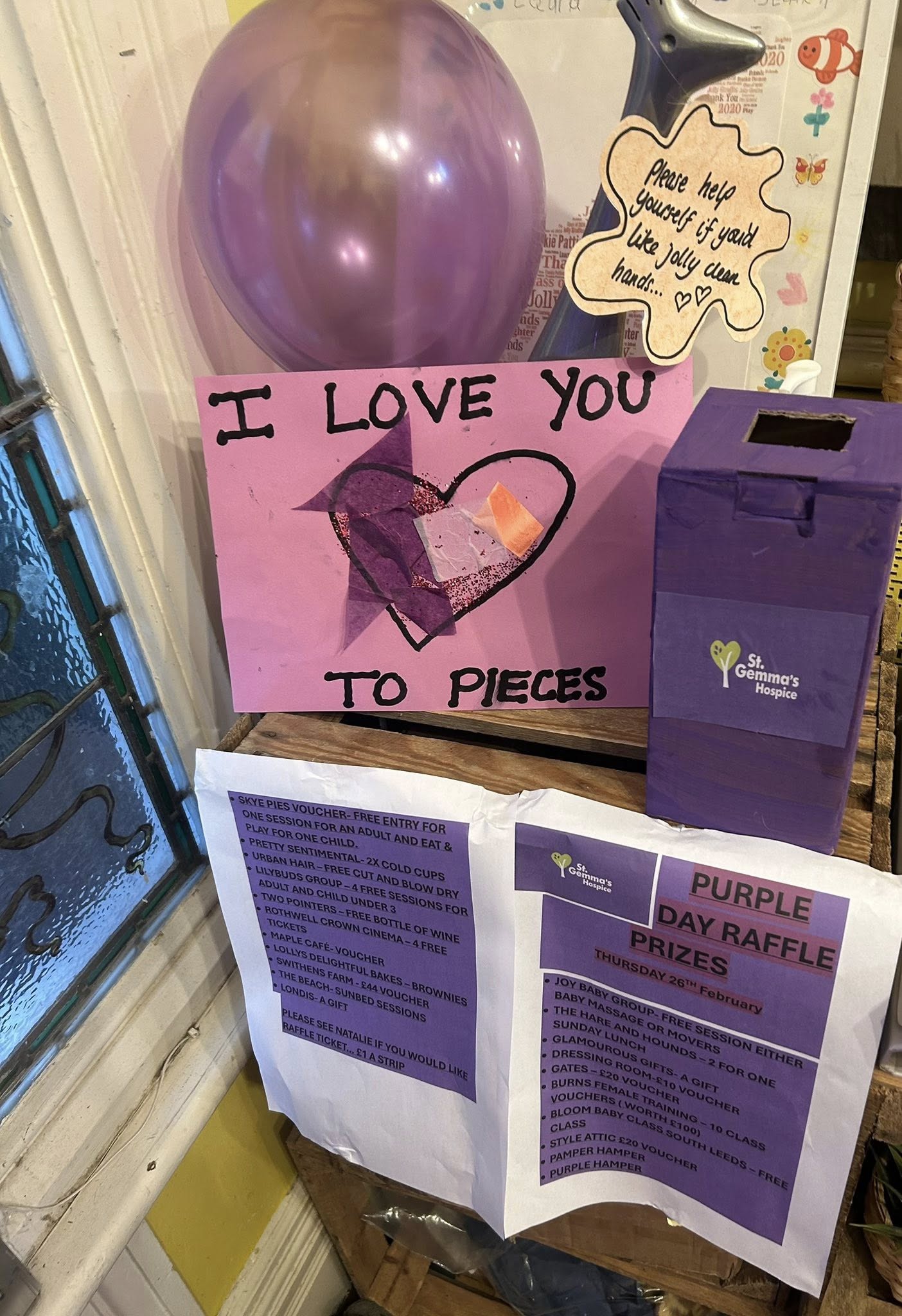 It’s fifteen years since Natalie (our very lovely Nat Nat) lost her dad and St Gemma’s were wonderful and supported the whole family through a devastating time. So to make her Dad proud and to say thank you to St Gemma’s Natalie has organised a purple day today here at Jollies.