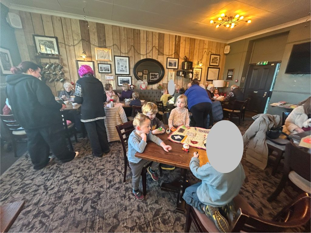 Today was our first trip up to the local Memory Cafe held up at the Two Pointers with some of our new Free-Flow group. It was very funny explaining to the children before they left that we were taking them to the pub!! We had some stories about when they have been there with their mummies and daddies and what they have eaten and where they have been sat etc!! We talked about walking super sensibly and crossing the road safely between Tracey and Nat Nat and using our great listening ears whilst we were out.